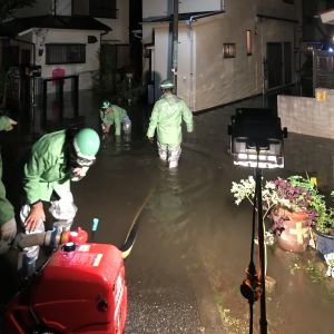 吉沢橋において土嚢積み作業を終えたところ、150メートルほど上流の鎌田一丁目付近にて浸水被害が出ているという情報が入り、既に排水作業中であった第五分団二部と合流し、一部と三部のポンプ合わせて三台での排水作業を行いました。午前一時過ぎには排水作業も完了し、撤収となりました。