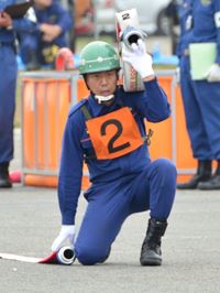 そこまでのタイムを競うのですが、2番員はポンプと放水地点との連絡やホースの運搬を担うので、ホースを担いで60メートルほどの距離を3本全力疾走します。