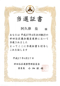 4/26投票の世田谷区議会議員選挙にて3608票、全体の39番目で当選させていただきました。