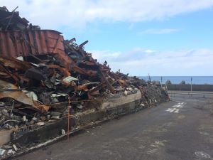 このような大火災の中、1 軒だけ焼失を免れた家屋がありました。家主の方は、平成十九年の中越沖地震の後、丈夫な家をと設計・建築されたとのことで、雨どいやエアコンの室外機は熱で溶けて変形しているにも関わらず、家屋そのものは無傷に近く、鎮火後すぐに家に戻って生活されているとのことでした。